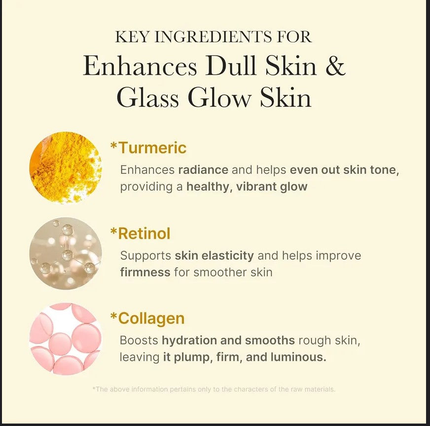Le curcuma unifie le teint, le rétinol renforce l'élasticité de la peau et le collagène stimule l'hydratation et lisse les peaux rugueuses.